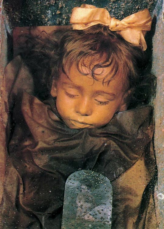One of the most celebrated intentionally mummified bodies is not that of a saint, but it is in Italy, in the Capuchin’s catacombs in Palermo, Sicily. It is the body of Rosalia Lombardo, who died in 1920 when she was only 2 years old. Her face is still rosy red, and she looks as though she is still alive, only sleeping. Her skin is flexible. Dr. Salafia, who also mummified various clergy members, preserved her using a mixture of formalin, glycerin, zinc, alcohol, and salicylic acids.